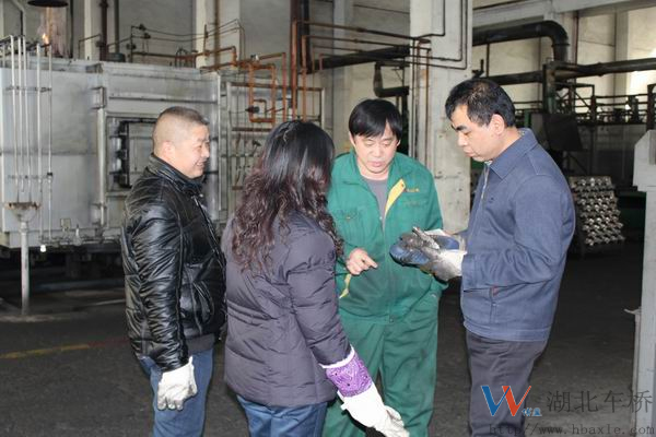12月1日,依維柯齒輪質(zhì)量呈現(xiàn)不規(guī)則波動跡象。熱處理車間相關(guān)人員立即碰頭進(jìn)行現(xiàn)場分析,力求盡快明確診斷,采取相應(yīng)控制措施。圖為滲碳壓淬工李永泉、資深熱處理技工趙建光、熱處理檢驗員曹玲、齒輪倒棱工陳國春在一起進(jìn)行QC攻關(guān)。