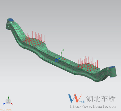 前軸模型采用10節(jié)點(diǎn)四面點(diǎn)單元,與轉(zhuǎn)向節(jié)采用固定連接(見圖1中蘭色標(biāo)記),朝-YC方向沿兩托板垂直各施加力(為額定載荷的2.5倍見圖1中紅色箭頭)。