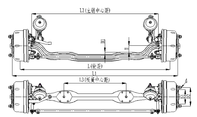 1.前軸為整體鍛造結(jié)構(gòu),采用加強(qiáng)設(shè)計(jì),承載能力強(qiáng);2.輪距、板簧距可靈活調(diào)整